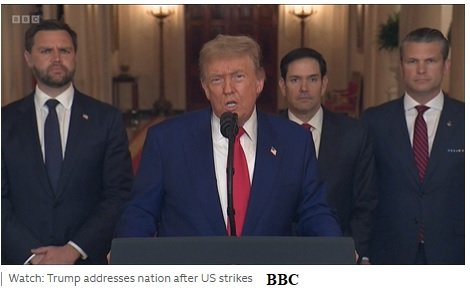 “Kemi përfunduar sulmin tonë shumë të suksesshëm në tre centralet bërthamore në Iran, duke përfshirë Fordow, Natanz dhe Esfahan.Të gjithë aeroplanët tani janë jashtë hapësirës ajrore të Iranit. Një ngarkesë e plotë me BOMBA u hodh në centralin kryesor, Fordow.